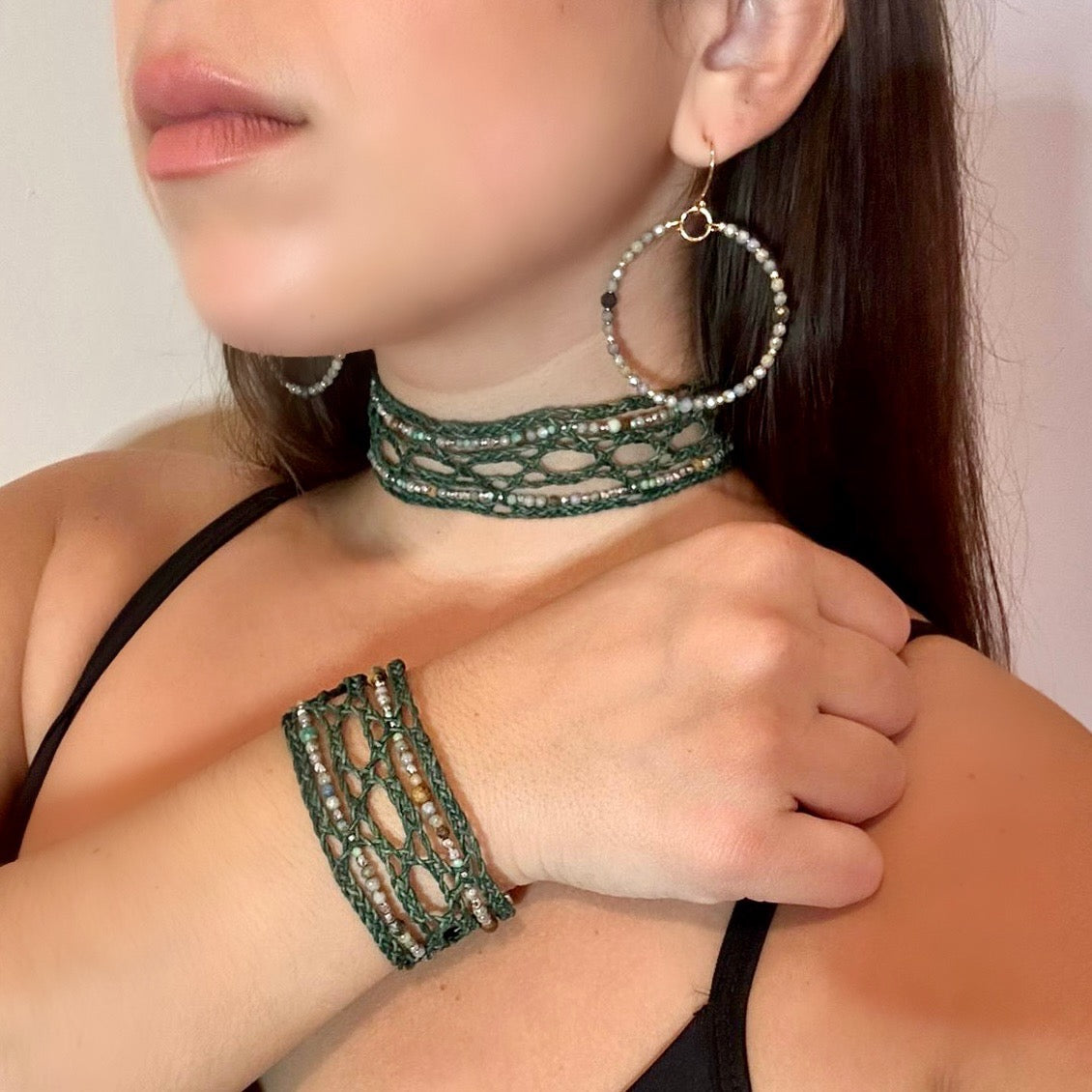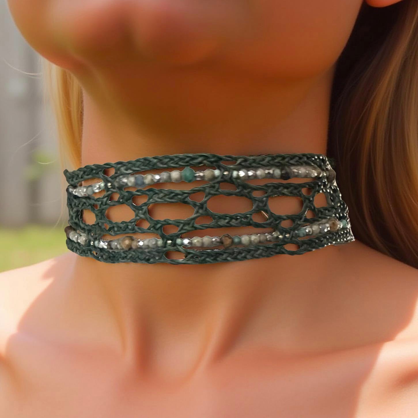 This choker channels untamed energy with sun-warmed leather and gemstone accents that whisper of desert trails, green oasis, and ancient rhythm. A tribute to your wild side—and your still center.