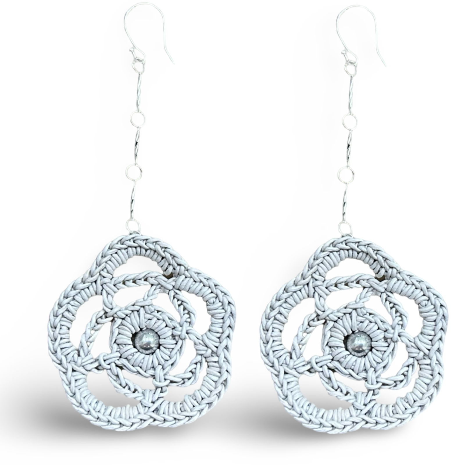 These handcrafted earrings are a celebration of quiet beauty and untamed style—where delicate lace blooms meet rustic elegance. Each pair features a hand-crocheted wildflower, fluttering from a trio of fine chain links, creating a movement that feels like wind in a meadow. Romantic, lightweight, and soulfully made—this piece belongs to the woman who listens to her heart and lets it guide her style.